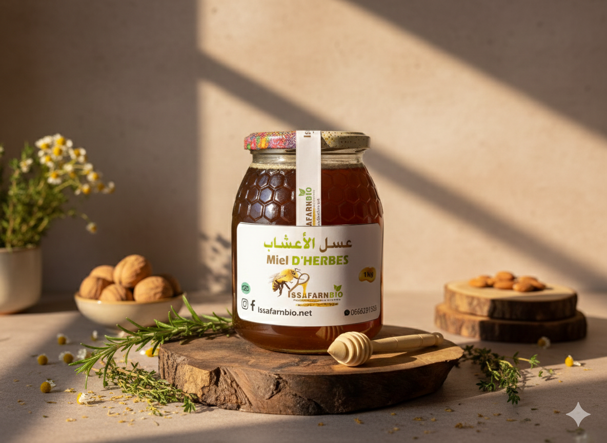 ISSAFARNBIO Herbal Honey is a premium natural honey carefully produced by the ISSAFARNBIO Cooperative, specialized in natural and organic Moroccan products.